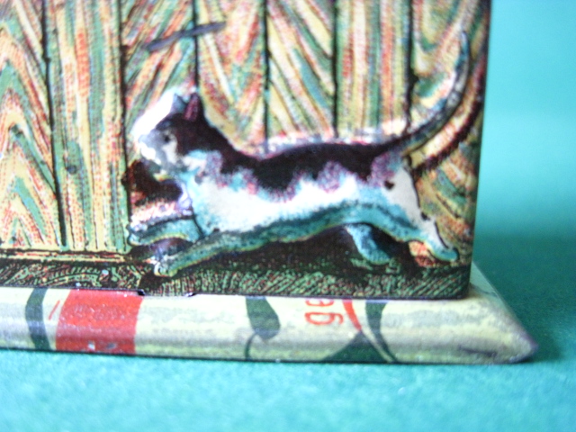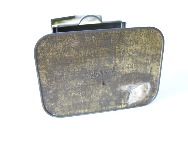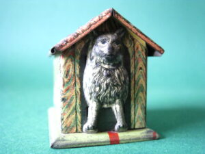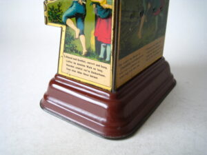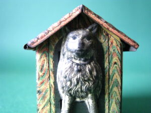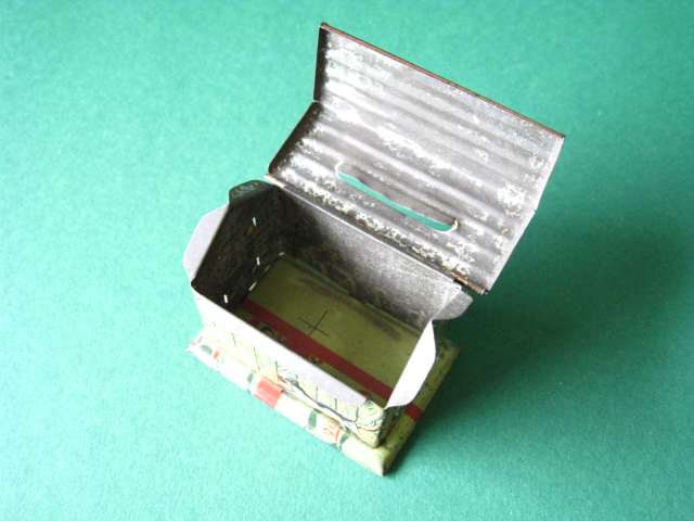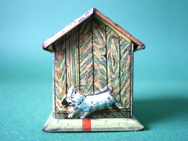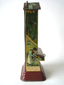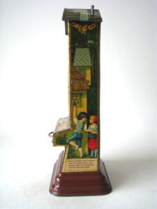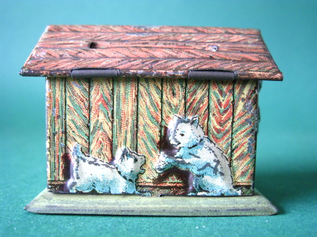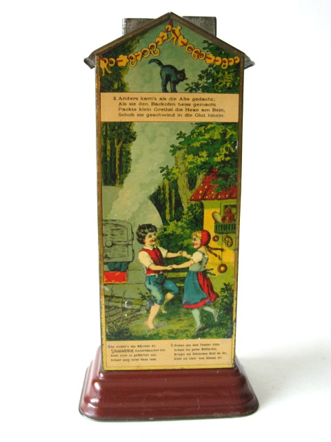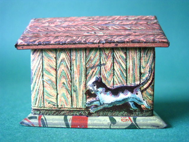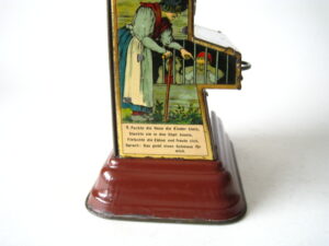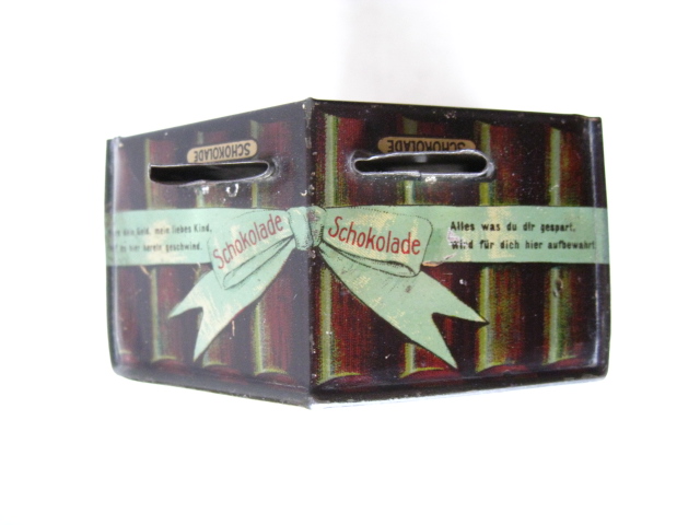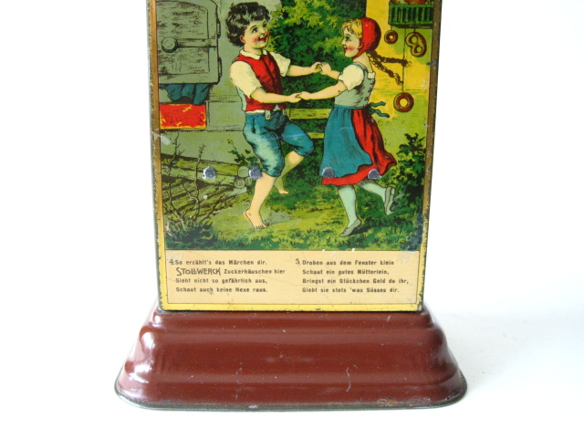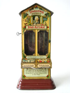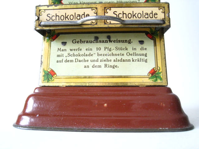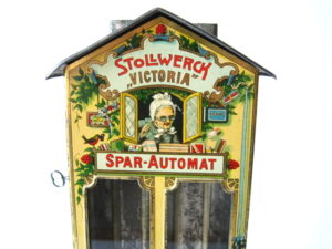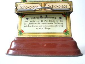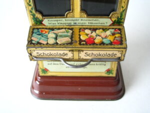 BanksStill bank Made in Germany 1900, maker unknownTin lithography ; 2.5 inches wide ; 6,5 cm. – embossedExcellent condition – Z: 2 ; very rare€ 295,- Stollwerck Spar-AutomatAnton Reiche – Germany 190010.5 inches tall – 27 cm. Pictures tell the Hansel & Grethel story by Gebr. GrimmNear mint condition – Z: 1-2 ; key included€ 750,- Saluting sailor mechanical bankSaalheimer & Strauss – Germany 1920s6.75 inches tall – 17 cm. Pressing lever on the side allows sailor to wave one arm & lower other arm exposing coin slotExcellent condition – Z: 2 € 550,- Chocolate cigarette bank Gundka, mechanical bank, made in Germany 1910Tin lithography ; 6 inches tall ; 15 cm. Near mint condition – Z: 1-2 € 495,- Woodpecker mechanical bankLorenz Bolz, W. Germany 1950 – first versionTin lithography ; 5.25 inches tall – 13 cm.Moves forward when turning the crank, opens bill, picks up money, bends backwards & drops the coin into the bankOld German coin & key includedVery good condition – Z: 3 € 145,- Hartwig & Vogel bank Mechanical chocolate bank, made in Germany 1920Tin lithography ; 5.25 inches tall ; 13,5 cm. Glass & key presentNear mint condition – Z: 1-2 € 450,- Hartwig & Vogel bank Mechanical chocolate bank, made in Germany 1920Tin lithography ; 5.5 inches tall ; 14 cm. Excellent condition – Z: 2 € 350,- Stollwerck cottage bankStill bank, made in Germany 1920Tin lithography ; base 8.5 x 6.5 cm. Near mint condition – Z: 1-2 € 195,-