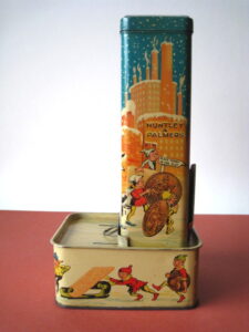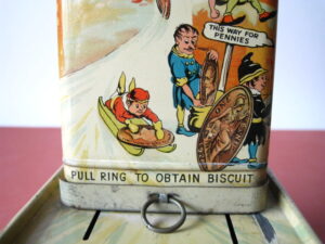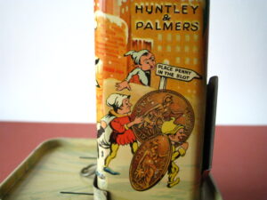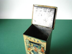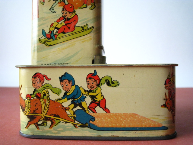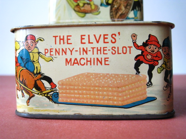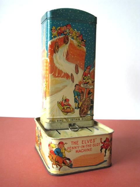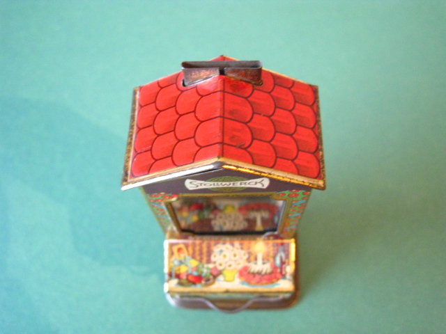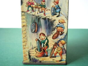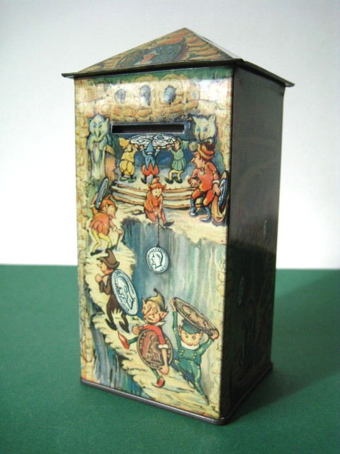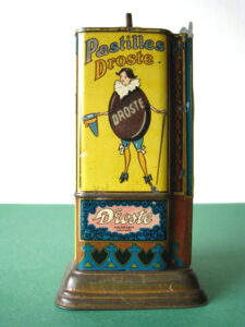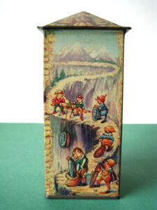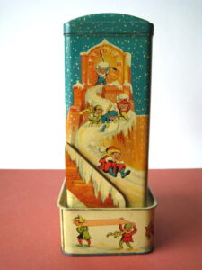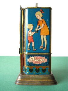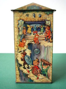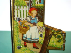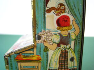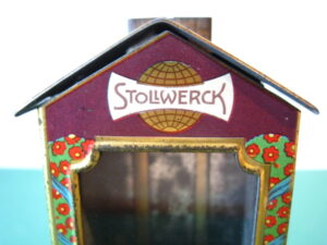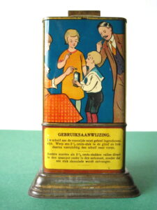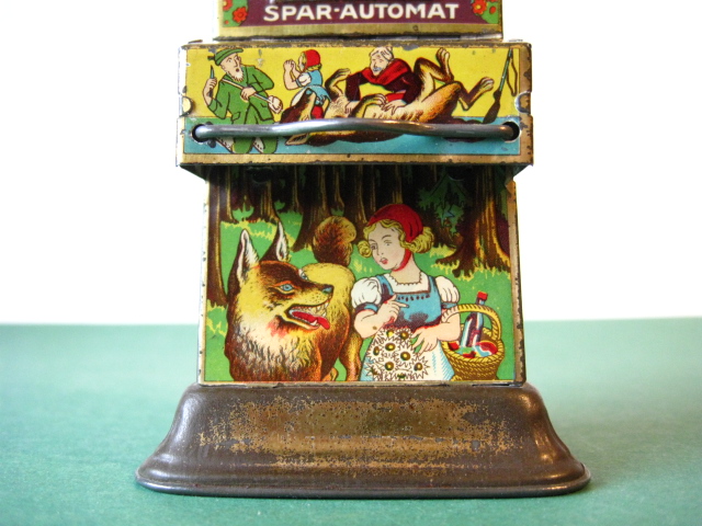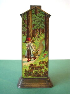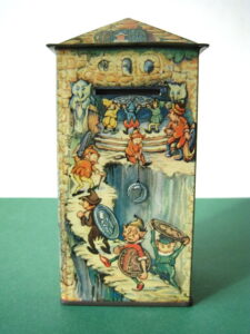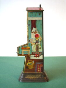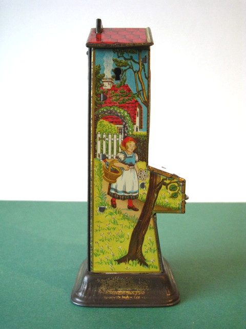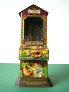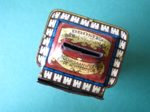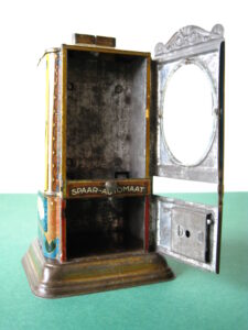 BanksDroste SpaarautomaatMechanical chocolate vending bank, made in Germany 1928Tin lithography ; 6 inches tall – 15 cm. The images are a design by Jan WiegmanExcellent condition – Z: 2 € 750,- Still bank with elvesHudson & Scott, England circa 1900Tin lithography ; 6.25 inches tall – 16 cm. Hinged opening roof – lid – very rareMint condition – Z: 1€ 450,- Stollwerck red riding hood bank Mechanical chocolate bank, made in Germany 1910Tin lithography ; 6.25 inches tall – 16 cm. Grimm Brothers fairy taleExcellent condition – Z: 2 € 450,- Huntley & Palmers ‘The Elves’ vending bank Made in England 1925, by Huntley, Boorne & StevensVending biscuit tin bankPlace a penny in the slot, pull the drawer knob back and cookies are dispendedTin lithography ; 8.75 inches tall ; 22 cm. Mint condition – Z: 1 € 950,- Stollwerck Spar-AutomatAnton Reiche – Germany 190010.5 inches tall – 27 cm. Pictures tell the Hansel & Grethel story by Gebr. GrimmNear mint condition – Z: 1-2 ; key included€ 750,- Saluting sailor mechanical bankSaalheimer & Strauss – Germany 1920s6.75 inches tall – 17 cm. Pressing lever on the side allows sailor to wave one arm & lower other arm exposing coin slotExcellent condition – Z: 2 € 550,- Chocolate cigarette bank Gundka, mechanical bank, made in Germany 1910Tin lithography ; 6 inches tall ; 15 cm. Near mint condition – Z: 1-2 € 450,- Woodpecker mechanical bankLorenz Bolz, W. Germany 1950 – first versionTin lithography ; 5.25 inches tall – 13 cm.Moves forward when turning the crank, opens bill, picks up money, bends backwards & drops the coin into the bankOld German coin & key includedVery good condition – Z: 3 € 145,- Hartwig & Vogel bank Mechanical chocolate bank, made in Germany 1920Tin lithography ; 5.25 inches tall ; 13,5 cm. Glass & key presentNear mint condition – Z: 1-2 € 450,- Hartwig & Vogel bank Mechanical chocolate bank, made in Germany 1920Tin lithography ; 5.5 inches tall ; 14 cm. Excellent condition – Z: 2 € 350,- Stollwerck cottage bankStill bank, made in Germany 1920Tin lithography ; base 8.5 x 6.5 cm. Near mint condition – Z: 1-2 € 195,-