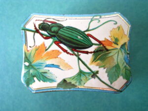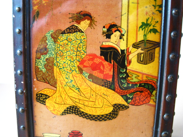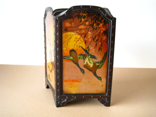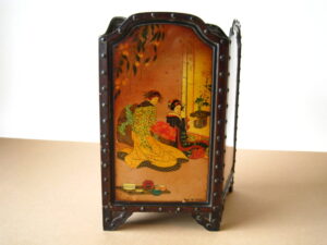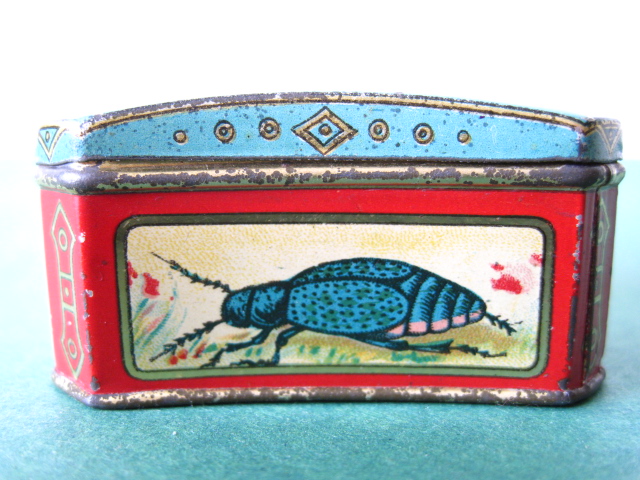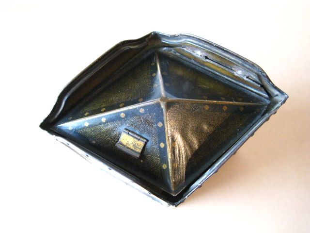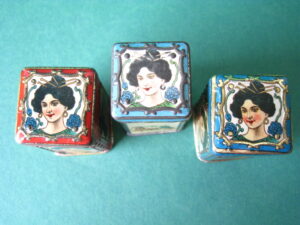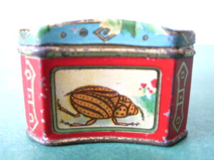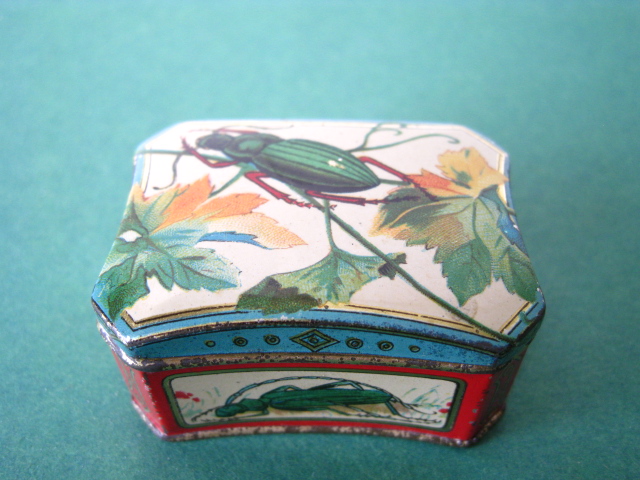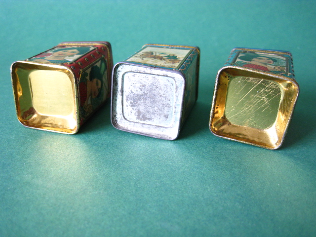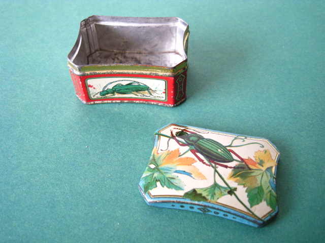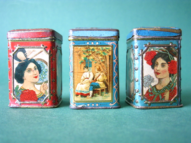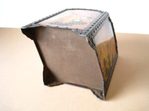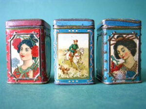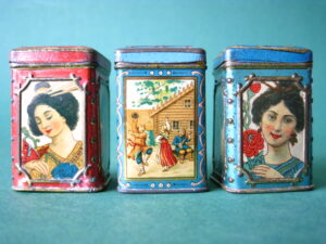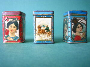 TinsScreenHuntley & Palmers, England 19137.5 inches tall ; 19 cm – hinged lid Made to simulate a Japanese folding screen, with nicely drawn decorationsNear mint condition ; Z: 1-2€ 245,- Spice sample tinGermany 1900 – lithography with insects 2.25 inches wide ; 5,5 cm – original lift off lidNear mint condition ; Z: 1-2€ 95,- 3 x spices sample tinGermany 1900 2 inches tall ; 5 cm – original lift off lidsNear mint condition ; Z: 1-2€ 175,- Nivea baby powder tinF. Vinatië Bordeaux France 1930 5 inches tall ; 12,5 cm – original capNear mint condition ; Z: 1-2€ 125,- Advertisement tinFrance 1910 – 3.5 inches wide ; 9 cm This tin is intended as an advertisement for this tin manufacturerExcellent condition ; Z: 2€ 175,- Chaussures IncroyableBallroom bookletMetaux Bagnolet Paris France 19204 inches tall ; 10 cm Excellent condition ; Z: 2€ 175,- ‘ Old London ‘Huntley & Palmers, England 18966 inches tall ; 15 cm Very good condition ; Z: 2-3 ( sugar paper sticker on 1 side )€ 175,- Chocolat tinMade for Belgium chocolate company Ruelle & Lecocq, Bruxelles Belgium ca 1900Embossed; 10.25 inches wide – 26 cm.Near mint condition – Z: 1-2€ 125,- LogHuntley & Palmers, England 19027 inches wide ; 18 cm – hinged lid with patent catchRepresents a section of a log of wood, decorated with designs of some of the smaller denizens of our forests.Excellent condition ; Z: 2€ 245,- PaletteHuntley & Palmers, England 19007.5 inches wide ; 18,3 cm In the form of an artist’s palette with 3 ‘brushes’ (in relief) attached showing scenes of contemporary transport on lid and around the sideExcellent condition ; Z: 2€ 275,- Sports tinBiscuit / candy tin, unknown maker, 1920s. Diameter: 7 inches – 18 cm ; lift off lidLithography shows sporting equipment for boxing, american football, soccer, hockey, tennis, golf & cricket.Excellent condition – Z: 2€ 125,- ‘ Polo ‘Felix Potin Paris 1920Biscuit tin – 7.5 inches wide ; 18 cm Detachable lidNear mint condition ; Z: 1-2 € 125,- Botanical tinMade in Germany 190012 inches wide ; 30 cm – hinged lid ; embossed frontThese tins were used to collect insects, leaves, muchrooms etc. out of the forrestExcellent condition ; Z: 2€ 175,- Statuary Biscuit tin, Huntley, Boorne & Stevens, England 19107 inches tall – 18 cm. ; hinged lidIn the form of a pedestal with 4 panels decorated with figures depicting the four seasonsExcellent condition – Z: 2€ 125,- WalletHuntley & Palmers, England 19037 inches wide ; 18 cm Lithography simulates snake skinExcellent condition ; Z: 2€ 125,- Large botanical embossed tinMade in Germany 1900 Botanical tins were often used by school – children to collect leaves, insects etc. from the woodThe large examples like this one were carryied by their teacher14.75 inches long ; 37 cm – original lock & strapExcellent condition – Z: 2 € 265,- Biscuits PareinJ. Schuybroek Belgium 1930 8.25 inches wide ; 21 cm.Very good condition – Z: 3€ 75,- DickensBiscuit tinHuntley, Boorne & Stevens; England 19116.25 inches wide – 16 cm.Simulate bound of books with titles of Charles Dickens4 variations of bound books were made; this is the rarest oneGood condition – Z: 3 € 245,-