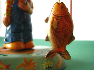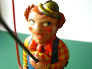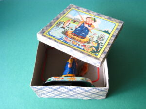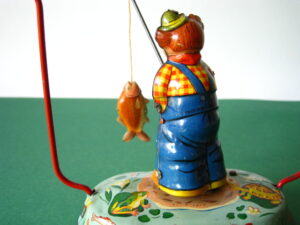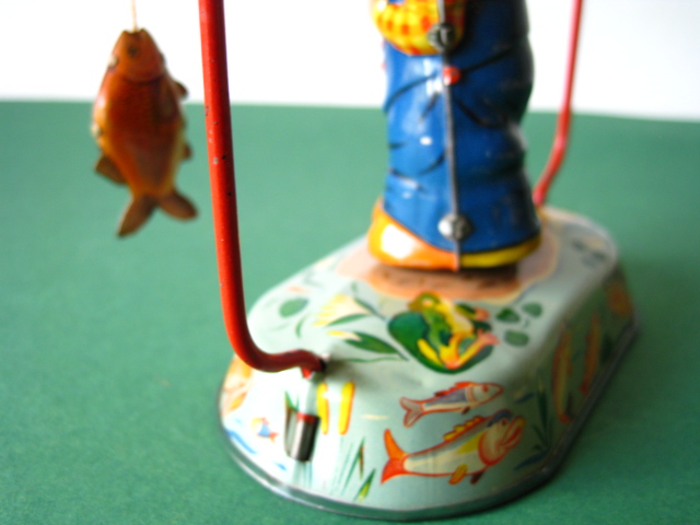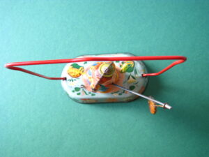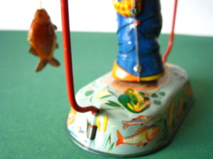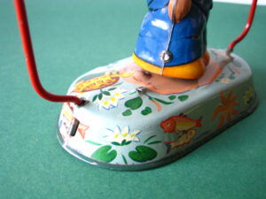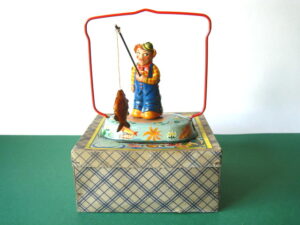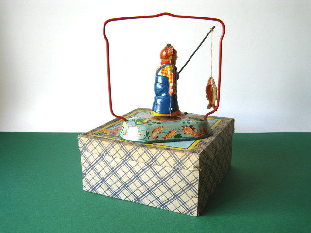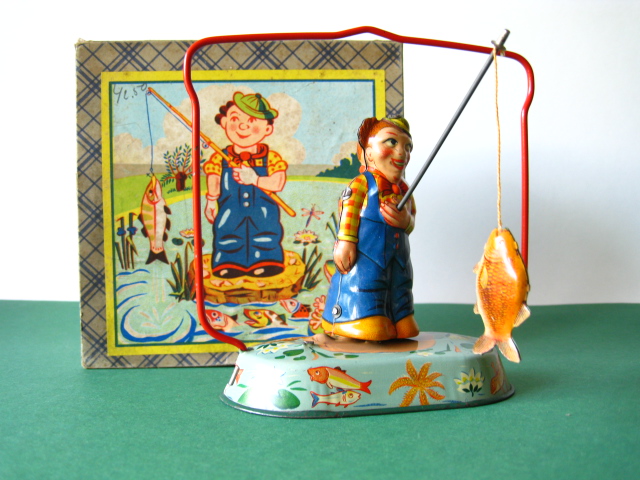 Tin Toys 1940-1960Angler with fishBlomer & Schuler, us zone Germany 1950Clockwork – 6 inches tall; 15 cm. – fixed keyThe fisherman turns back & forth, causing the fish to attach itself to the side, then wriggle free etc.NMIB condition ; Z: 1-2 – original string€ 350,- Clown with donkey cartProbably made in Germany ca 1950Clockwork – 7.5 inches long; 19 cm. – fixed keyA rare variation on the well-known Lehmann cartsMint condition ; Z 1€ 245,- Tumbling ChimpTPS, made in Japan 1960Clockwork – 4.5 inches tall; 11,5 cm. – fixed keyLong armed chimpanzee tumbling with handstandsTin with felt (original hat)Toy is mint with excellent complete box€ 225,-
