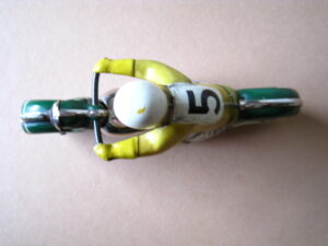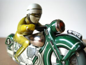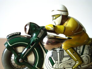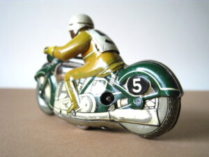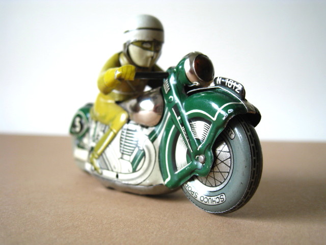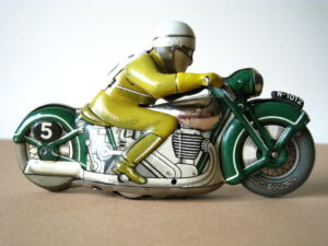 Motorcycles & Cars 1880-1940Sport motorcycleSchuco – made in Germany 1937Clockwork – 5 inches long ; 12,5 cm Drives & does not fall from tableExcellent condition, Z: 2€ 395,- Also automobileLehmann – made in Germany 1920Clockwork – 4.25 inches long ; 10,5 cm – fixed Lehmann keyThese Lehmann cars were always sold without a boxNear mint condition, Z: 1-2€ 550,- Ambulance Militaire – Peugeot 201G. de Andreis – made in France 1930sClockwork – 6.5 inches long ; 16,5 cm – fixed keyOpening roof – Excellent condition, Z: 2€ 350,- MotorcycleArnold / CKO – made in Germany 1930sClockwork – 7.5 inches long ; 19 cm – fixed keyOriginal headlamp lens, rifle & leather beltNear mint condition, Z: 1-2€ 950,- AlsoLehmann – made in Germany 1930sClockwork – 4.25 inches long ; 10,5 cm – fixed Lehmann keyThese Lehmann cars were always sold without a boxMint condition, Z: 1€ 495,- AHALehmann – made in Germany 1920sClockwork – 5.5 inches long ; 14 cm – fixed Lehmann keyAdjustable steering, opening doorsNear mint condition, Z: 1-2( clockwork mechanisme needs to be adjusted )€ 395,-
