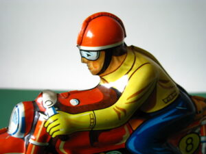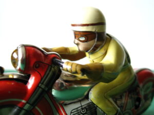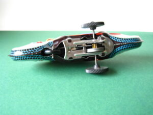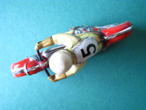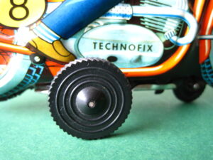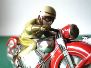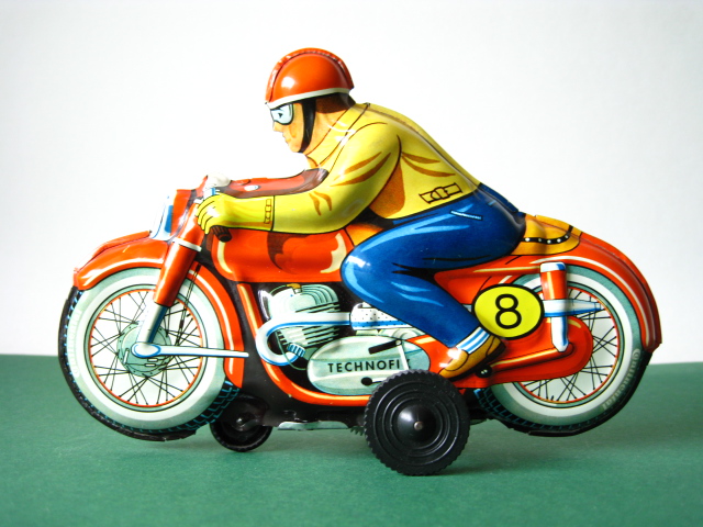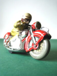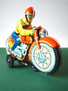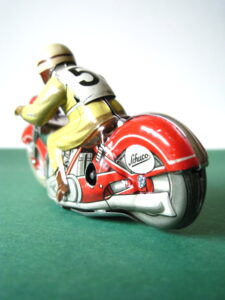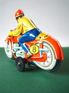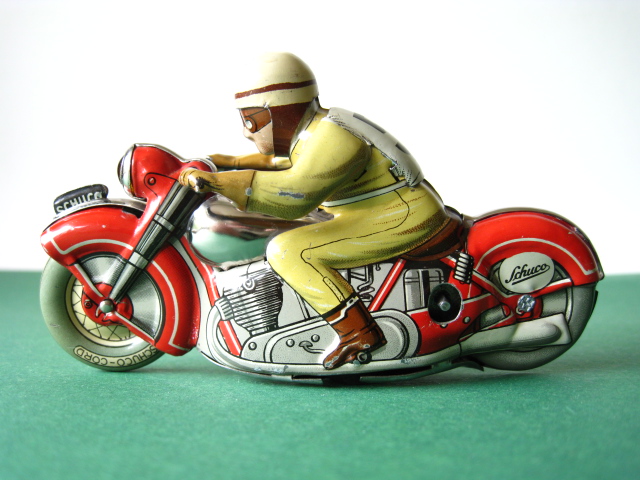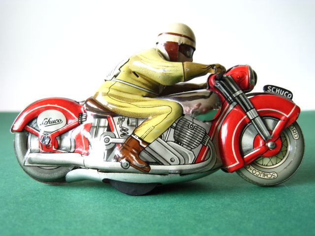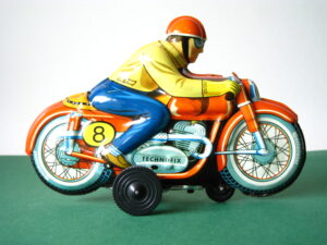 Motorcycles & Cars 1940-1960Mirakomot motorcycleSchuco, made in us zone Germany 1950Clockwork – 5 inches long; 12,5 cm.Does not fall from table; turns & drives onOriginal box (all sideflaps present)NMIB condition – Z: 1-2 € 550,- Motodrill motorcycleSchuco, made in us zone Germany 1950Clockwork – 5 inches long; 12,5 cm.Drives, turns & drives on etc.Near mint condition – Z: 1-2 € 350,- MotorcycleTechnofix, made in Western Germany 1967Friction operated with siren – 7.25 inches long; 18 cm.Near mint condition – Z: 1-2 € 220,- Socius motorcycleCKO Kellermann, made in Germany 1938Clockwork – 5.75 inches long; 14,5 cm.Clockwork mechanisme does not workNear mint condition – Z: 1-2 € 395,- Tokyo Bonnet busMade in Japan 1940sFriction powered with engine sound8.75 inches long; 22 cm.Near mint condition – Z: 1-2 € 595,- Motorcycle & sidecarJet King, made in Japan 1950Friction powered – 3.75 inches long; 9,5 cm.Female passengerExcellent condition – Z: 2 € 350,- Panda on motorcycle Made in China 1960s3.5 inches long; 9,5 cm Pull back, let it go & it will runNear mint in box condition€ 175,- Chevrolet CorvetteYonezawa, made in Japan 1959Friction powered – 10 inches long; 25 cm.Near mint condition – Z: 1-2€ 450,- Motorcycle Tipp & Co – Western Germany 1968Friction – 6.25 inches long; 16 cm.Near mint condition – Z: 1-2€ 220,- Motorcycle & sidecarHuki – made in us zone Germany 1950Clockwork – 3.25 inches long; 9,5 cm Detachable sidecarNear mint condition – Z: 1-2€ 195,-