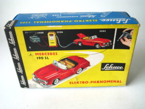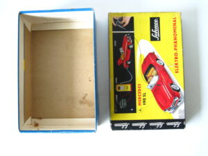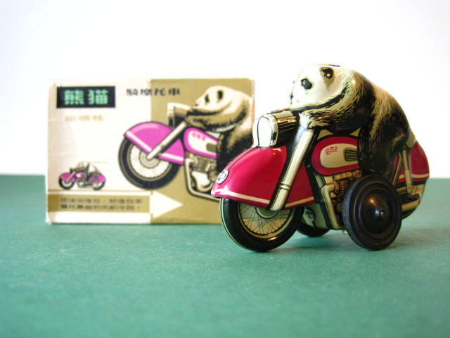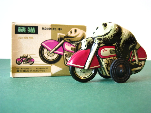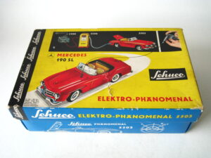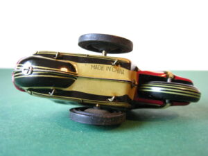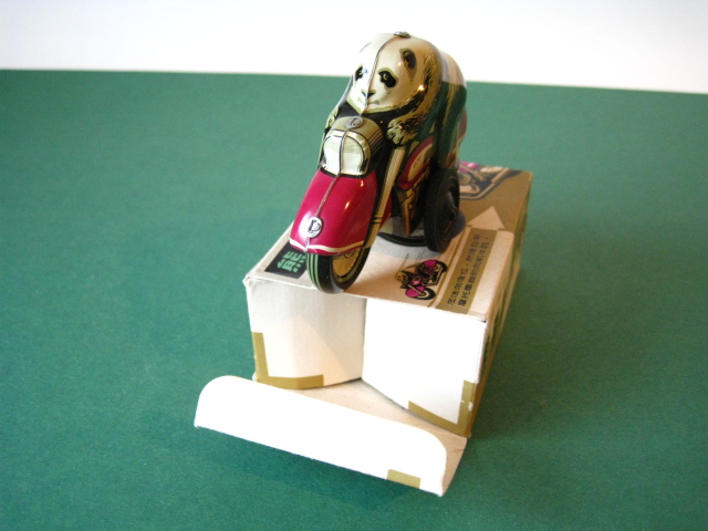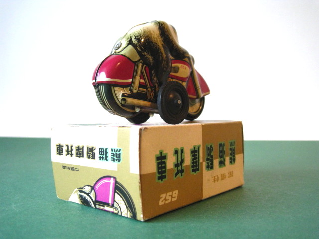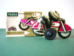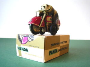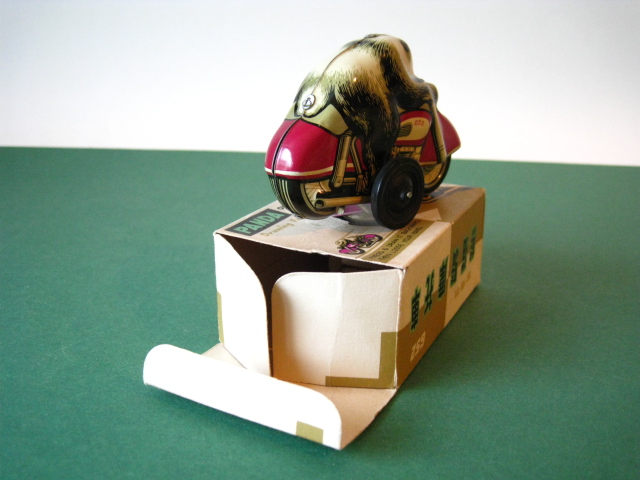 Motorcycles & Cars 1940-1960Panda on motorcycle Made in China 1960s3.5 inches long; 9,5 cm Pull back, let it go & it will runNear mint with very good box condition€ 195,- Original boxMade by Schuco for the Electro – Phänomenal Mercedes # 55031955 – 1969 ; length of box: 23 cm.Excellent condition – Z: 2 ; 1 hole in box (see pictures)€ 75,- Mirakomot motorcycleSchuco, made in us zone Germany 1950Clockwork – 5 inches long; 12,5 cm.Does not fall from table; turns & drives onOriginal box (all sideflaps present)NMIB condition – Z: 1-2 € 550,- Motodrill motorcycleSchuco, made in us zone Germany 1950Clockwork – 5 inches long; 12,5 cm.Drives, turns & drives on etc.Near mint condition – Z: 1-2 € 350,- MotorcycleTechnofix, made in Western Germany 1967Friction operated with siren – 7.25 inches long; 18 cm.Near mint condition – Z: 1-2 € 220,- Socius motorcycleCKO Kellermann, made in Germany 1938Clockwork – 5.75 inches long; 14,5 cm.Clockwork mechanisme does not workNear mint condition – Z: 1-2 € 395,- Tokyo Bonnet busMade in Japan 1940sFriction powered with engine sound8.75 inches long; 22 cm.Near mint condition – Z: 1-2 € 595,- Motorcycle & sidecarJet King, made in Japan 1950Friction powered – 3.75 inches long; 9,5 cm.Female passengerExcellent condition – Z: 2 € 350,- Chevrolet CorvetteYonezawa, made in Japan 1959Friction powered – 10 inches long; 25 cm.Near mint condition – Z: 1-2€ 450,- Motorcycle Tipp & Co – Western Germany 1968Friction – 6.25 inches long; 16 cm.Near mint condition – Z: 1-2€ 220,- Motorcycle & sidecarHuki – made in us zone Germany 1950Clockwork – 3.25 inches long; 9,5 cm Detachable sidecarNear mint condition – Z: 1-2€ 195,-
