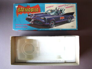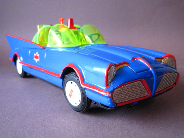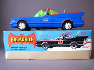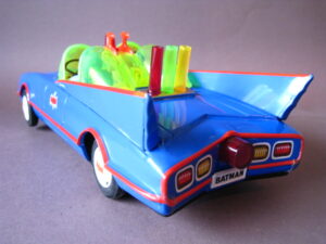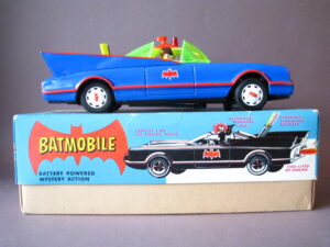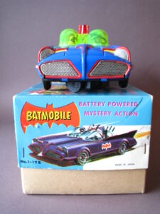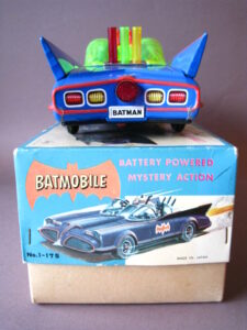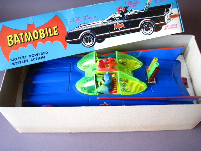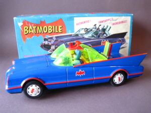 Motorcycles & Cars 1940-1960BatmobileAoshin, made in Japan 1972Battery operated – 11.5 inches long; 29,5 cm.All functions tested & in working orderThe car is in mint condition – Z: 1Original complete box including inner inlay€ 1500,- Motodrill motorcycleSchuco, made in us zone Germany 1950Clockwork – 5 inches long; 12,5 cm.Drives, turns & drives on etc.Near mint condition – Z: 1-2 € 295,- Panda on motorcycle Made in China 1960s3.5 inches long; 9,5 cm Pull back, let it go & it will runNear mint with very good box condition€ 165,- Original boxMade by Schuco for the Electro – Phänomenal Mercedes # 55031955 – 1969 ; length of box: 23 cm.Excellent condition – Z: 2 ; (1 hole in box, see pictures)€ 55,- Mirakomot motorcycleSchuco, made in us zone Germany 1950Clockwork – 5 inches long; 12,5 cm.Does not fall from table; turns & drives onOriginal box (all sideflaps present)NMIB condition – Z: 1-2 € 495,- MotorcycleTechnofix, made in Western Germany 1967Friction operated with siren – 7.25 inches long; 18 cm.Near mint condition – Z: 1-2 Socius motorcycleCKO Kellermann, made in Germany 1938Clockwork – 5.75 inches long; 14,5 cm.Near mint condition – Z: 1-2 ( Clockwork mechanisme does not work) € 375,- Tokyo Bonnet busMade in Japan 1940sFriction powered with engine sound8.75 inches long; 22 cm.Near mint condition – Z: 1-2 ( extremeley hard to find )€ 550,- Chevrolet CorvetteYonezawa, made in Japan 1959Friction powered – 10 inches long; 25 cm.Near mint condition – Z: 1-2€ 450,- Motorcycle Tipp & Co – Western Germany 1968Friction – 6.25 inches long; 16 cm.Near mint condition – Z: 1-2€ 220,-
